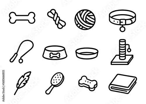 Pet Care Icon Set. Outline icon set of pet-related items under furniture: dog bone, chew toy, cat ball, collar