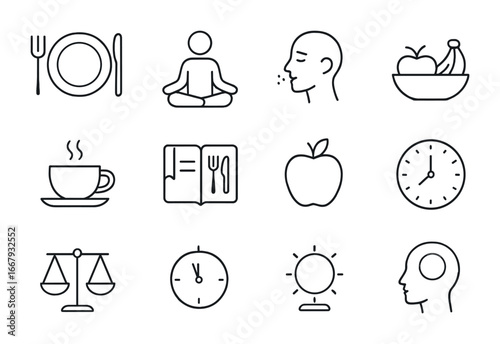 Mindful Eating Icons. Outline icon set of mindful eating: plate, fork, knife, meditation pose, slow chew,