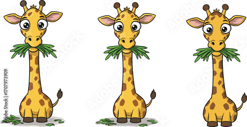 Cute cartoon giraffes chewing green leaves, jungle animal illustration, educational wildlife clipart, adorable zoo characters for children learning materials