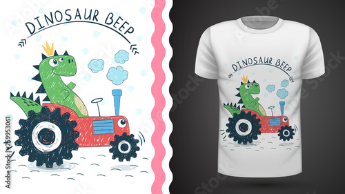 little dinosaur riding a classic  motorcycle. Cute dino sports t-shirt for kids Vector cartoon illustration.