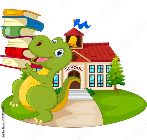 Funny dinosaur driving excavator. Digging Dino holding egg