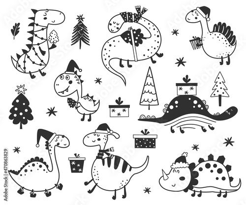 Cute christmas happy dino collection. Set of festive dinosaurs and decoration.