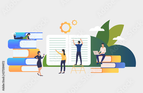 Media book library concept with character. People reading an e-book to study on e-library at school. E-learning online archive. Modern flat style for landing page, mobile app, hero images