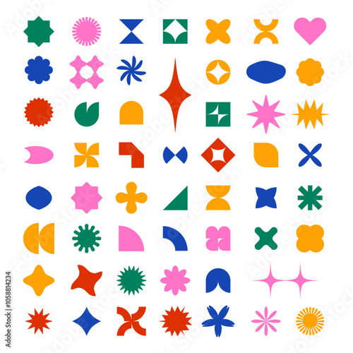 Y2K brutalism abstract elements set. Simple geometric shapes, stars and flowers. Trendy modern graphic icons for decoration, posters, futuristic design. Black silhouettes isolated on white background