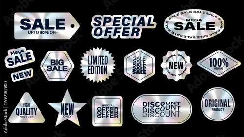 Tags and stickers with holographic effect and watermark: Sale, Black Friday, 100% original, offer, discount, Best price, Premium product, 50%, 70%, Half Price. Hologram various geometric shapes.
