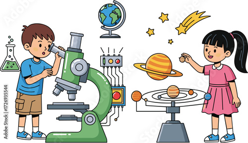 Education in university or collage, student is doing homework or preparing for exam, vector outline illustration set, study sciences and graduate.
