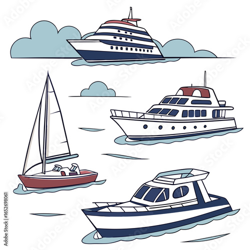 Various sailing ships depicted in a simple graphic design showcasing different styles of vessels on a white background