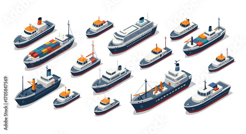 Naval Armada in Passage: A collection of diverse maritime vessels navigate open waters, showcasing varied hull colors.
