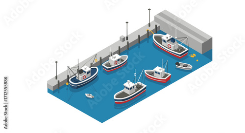 Isometric marina scene with fishing boats docked at pier on calm waters