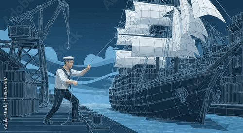 Modern Harbor Design Concept – Black and White Vector Poster of Two Designers Overlooking Miniature Ships and Cranes
