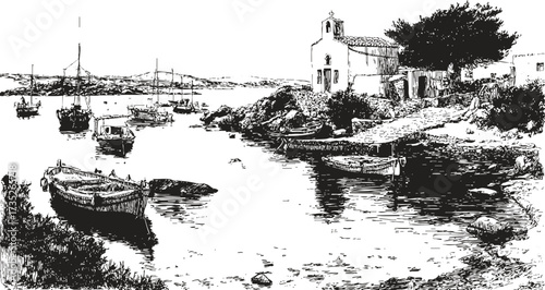 Seaport  City Landscape with boat and cargo ship Illustration Line art vector