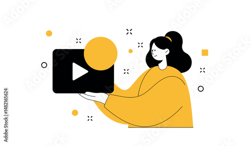 Shopping cart icon in blue speech bubble, play button icon, sample text, and black lines. Ideal for e-commerce, online shop, video content, digital marketing, user interface, web design, multimedia