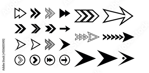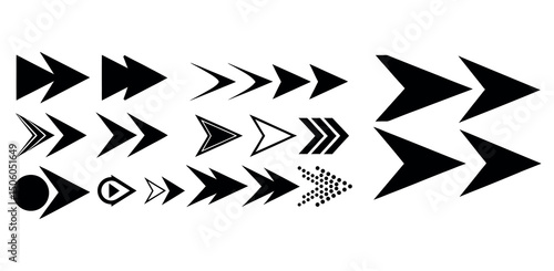 Set of Various Black Arrow Icons on White Background,  collection of diverse arrow icons in a bold black silhouette against a clean white arrow icons, perfect for user interface (UI) design, icon, i