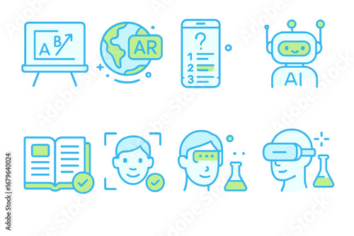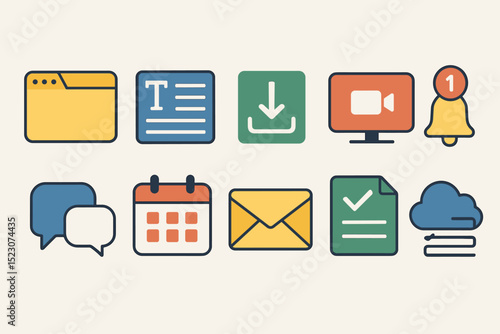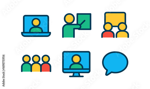 Collection of web icons representing communication, education, and digital interaction in various formats for tech applications