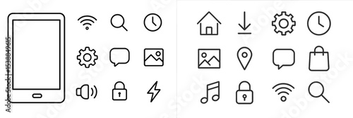 A collection of line icons for user interfaces, featuring outline, minimalist, navigation, and app symbols