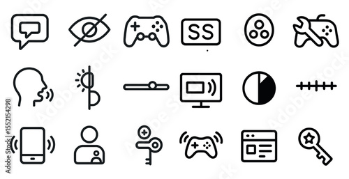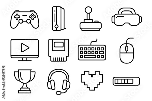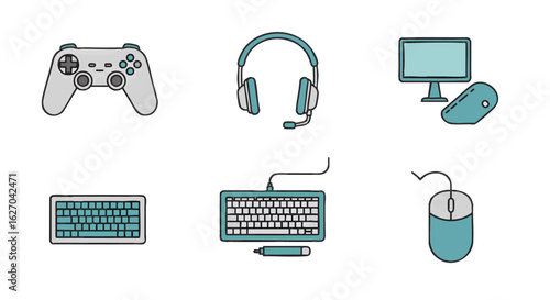 Collection of gaming equipment and computer peripheral icons. Vector illustration set with gamepad, headset, and keyboard. num1 (293).