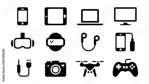 Silhouette icons of modern technology devices: smartphones, gadgets, and game controllers