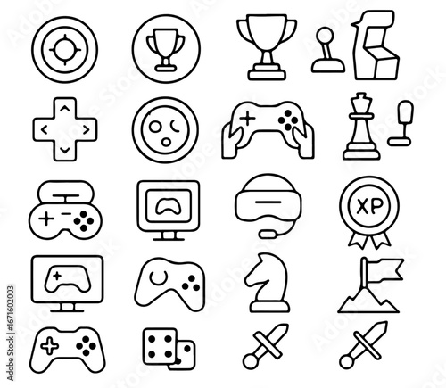 A collection of gaming icons, capturing the essence of interactive entertainment and competition, from controller to achievement and game symbols.