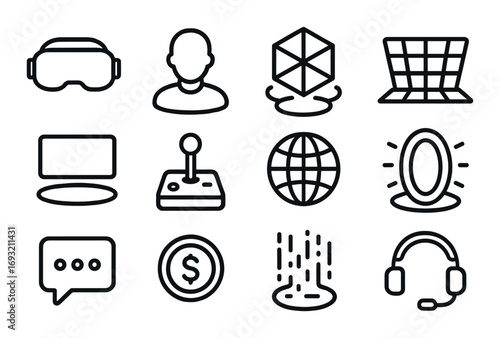Virtual reality linear icon set. featuring vr headset, avatar, cube, grid, monitor, joystick, globe, portal, chat, coin, matrix, headset.