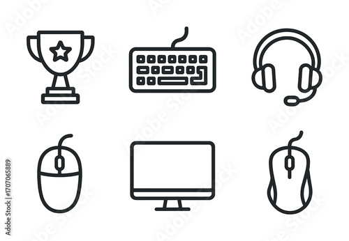 Gaming equipment icons: trophy, keyboard, headset, mouse, monitor