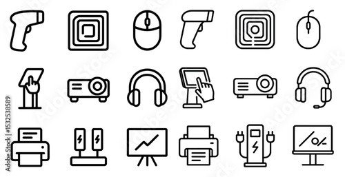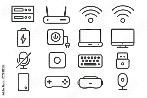 Technology devices linear icon set. featuring router, wi-fi, battery, computer, microphone, keyboard, usb, game controller
