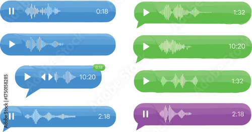 A collection of colorful vector voice message bubbles for a chat application interface, featuring audio waveforms, playback controls, and timestamps on a white background