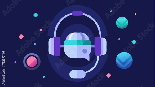 A futuristic headset with mic paired with floating holographic chat icons around it symbolizing a virtual conversation.