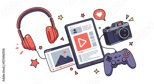Technology tools for immersive virtual reality experiences and interactive systems, including VR headset, motion controller, touch keyboard, and webcam monitor setup, vector cartoon illustration