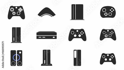 Collection of gaming consoles and controllers in black and white vector illustration design style silhouette