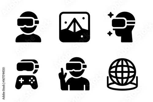 Virtual reality solid icon set. vr, gaming, interactive experience icons solid collection