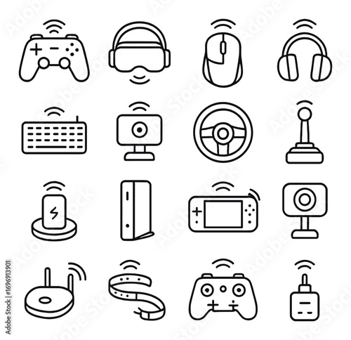 Gaming gadgets linear icon set. featuring gamepad, vr headset, mouse, headphones, keyboard, webcam, steering wheel
