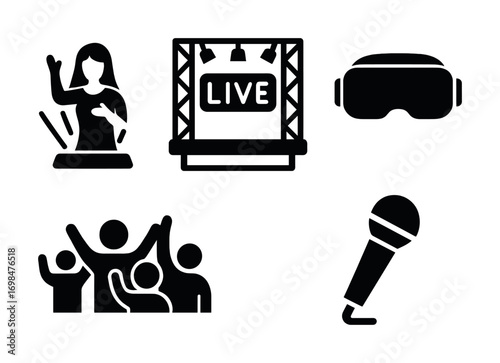 Virtual concert experience icons set with female singer, vr headset, live stage, audience, microphone