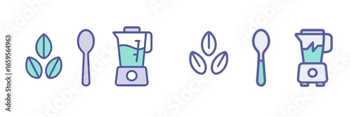 Kitchen appliances line icon set with various household equipment. Includes a mixer, kettle, toaster, coffee maker, and blender for cooking and beverage preparation