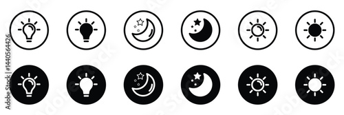 Vector day and night switch icons featuring sun and moon designs for light and dark mode. Screen brightness and contrast level control icons. Day night switch. Vector Illustration.