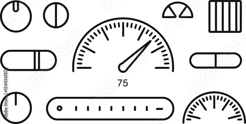 Black and white vector illustrations of gauges switches and various interface elements