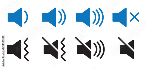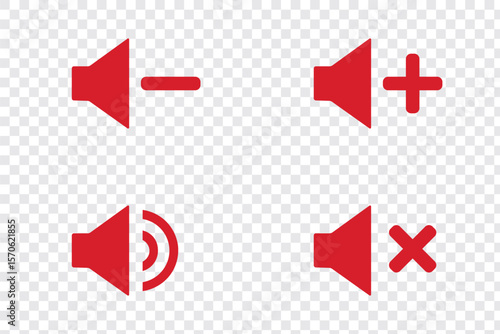 Set of four speaker icons representing mute, unmute, volume up, and volume down options for user interface and audio settings. Plus, minus, cross symbol icon. Eps 10