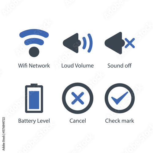 Wifi Network, Loud Volume, Sound off, Battery Level, Cancel, Check mark, icon