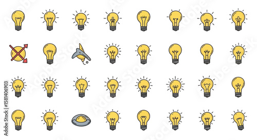 Set of Vector Icons Cartoon Light Bulbs with Rays Switch and Dimmer Icons Pattern. Vector Illustrations. EPS Editable