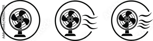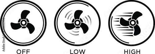 Three icons showing a fan at different speeds off, low speed with gentle airflow, and high speed with strong airflow, isolated on white background