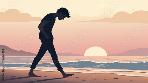 Young Man Walking Alone on Beach at Sunset – Reflection and Solitude Vector Scene