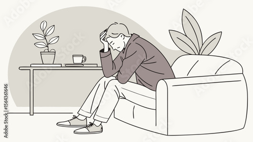 Illustration of a depressed young man lying on a sofa in a modern interior setting