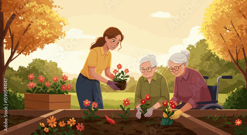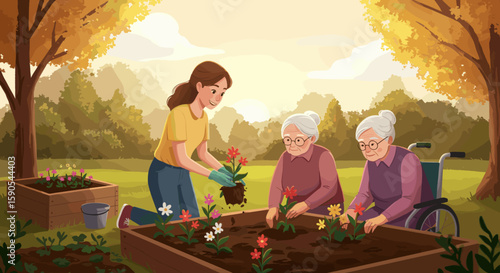 The serene outdoor environment promotes bonding, care, and community support, especially for the elderly.