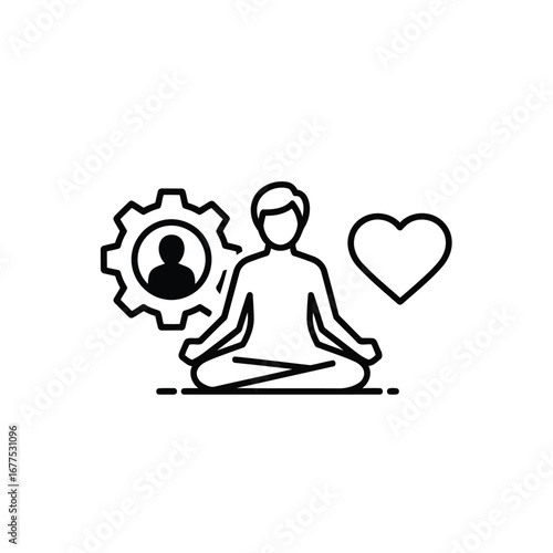 minimalist meditation icon showing seated figures in lotus pose with hand mudra, black and white vector symbol of mindfulness and calm