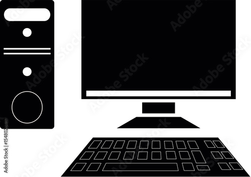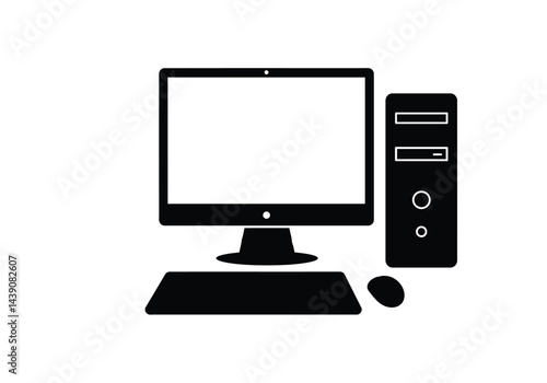 Computer Silhouette. This image shows a black silhouette of a computer setup, including a monitor, keyboard, and mouse, also referred to as a PC or desktop. Vector clipart illustration design.