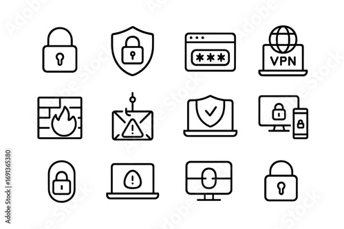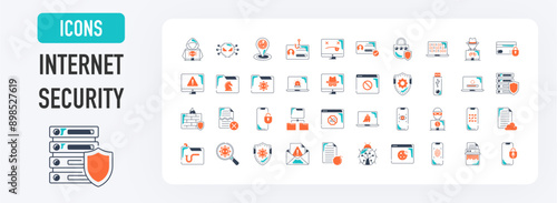 Numerous cybersecurity icons depicting data protection, secure connections, privacy, hacking threats, and compliance measures. Ideal for digital security, cyber threats, data privacy, internet malware