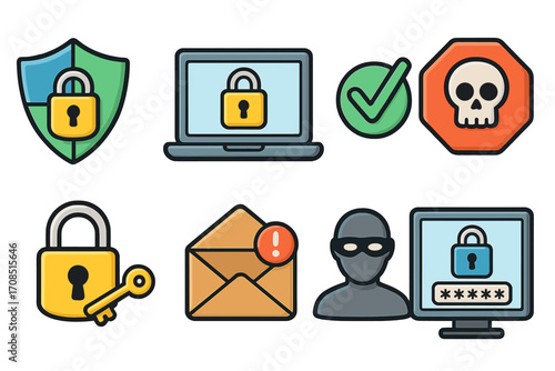 Flat vector icons of cybersecurity: hacker, phishing, secure code, VPN, antivirus, secure chat, encrypted file, strong password.