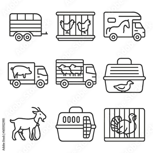 Animal Transport Icons. Outline style icons of Animal Transport: livestock trailer, cage for poultry, horsebox, pig carrier, sheep