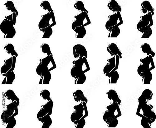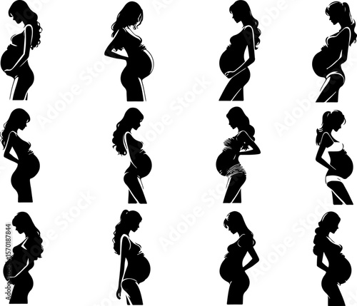 Prenatal Yoga Silhouettes: A set of  ten silhouette illustrations showcasing a diverse range of prenatal yoga poses designed for expecting mothers.