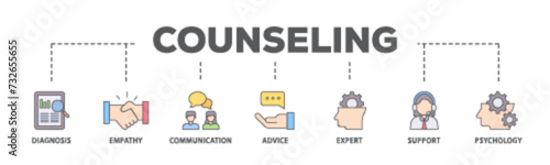 Counseling banner web icon vector illustration concept for counseling psychology and mental healthcare with an icon of diagnosis, empathy, communication, therapy, advice, expert, and support icons.