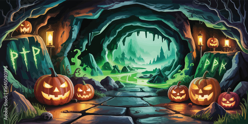 Glowing cave entrance with green mist, carved pumpkins, and runes